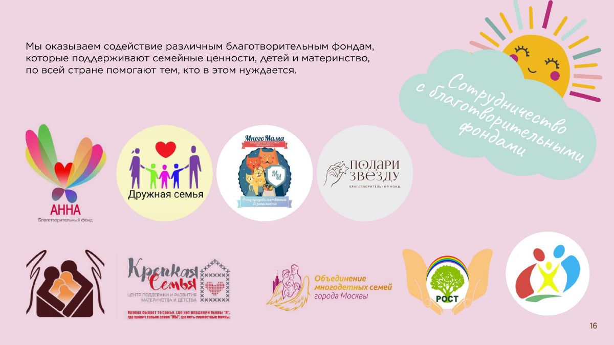 Мы оказываем содействие различным благотворительным фондам, которые поддерживают семейные ценности, детей и материнство, по всей стране помогают тем, кто в этом нуждается.