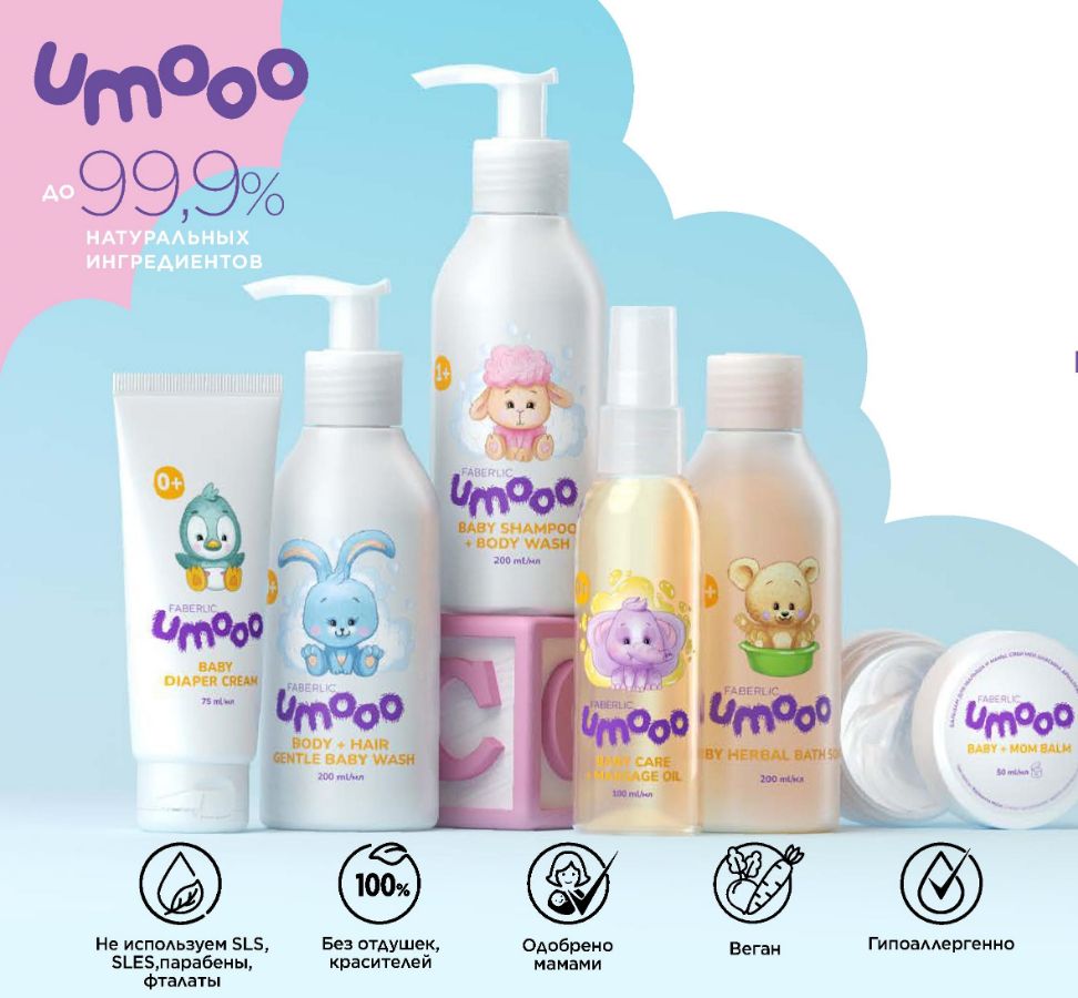Кожа младенцев очень чувствительна и быстро теряет влагу. Поэтому в основе формул UMOOO лежит сквалан — мощный увлажняющий компонент. Он обеспечивает надежную защиту и надолго удерживает влагу в коже.