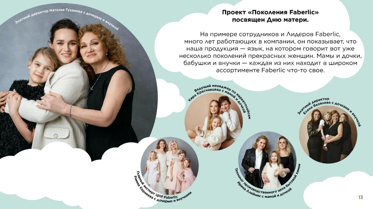 Посвящен Дню матери. На примере сотрудников и Лидеров Faberlic, много лет работающих в компании, он показывает, что наша продукция — язык, на котором говорит вот уже несколько поколений прекрасных женщин. Мамы и дочки, бабушки и внучки — каждая из них находит в широком ассортименте Faberlic что-то свое.