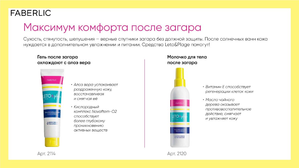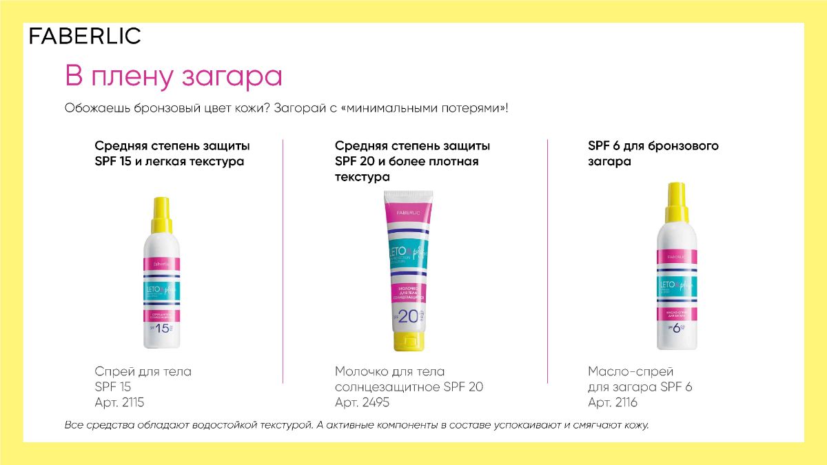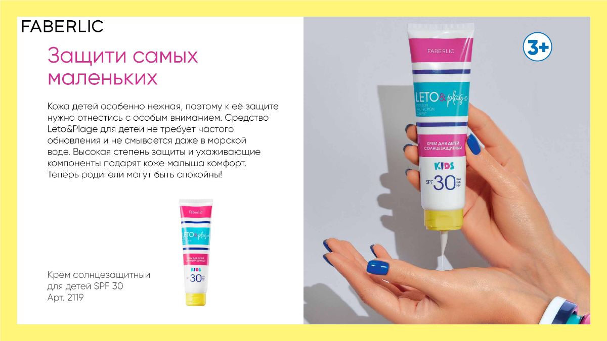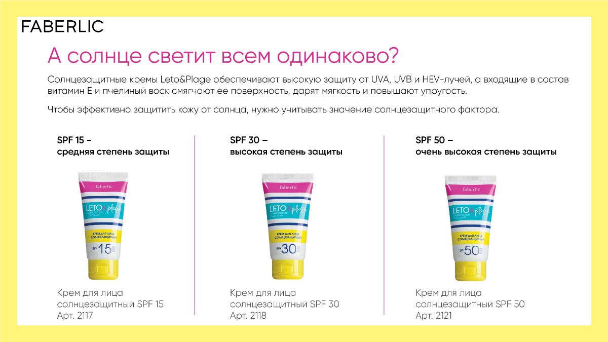 Солнцезащитные кремы Leto&Plage Faberlic обеспечивают высокую защиту от UVA, UVB и HEV-лучей, а входящие в состав витамин Е и пчелиный воск смягчают ее поверхность, дарят мягкость и повышают упругость.