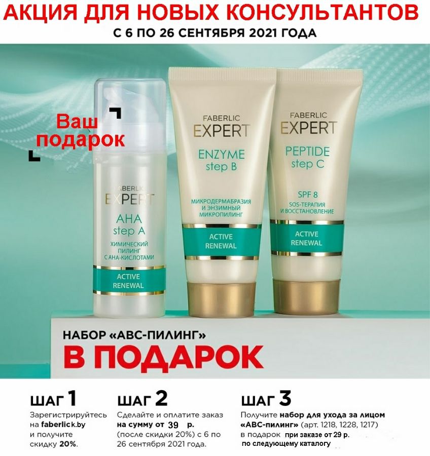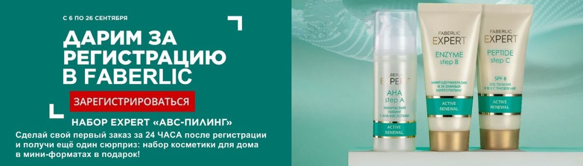 При бесплатной регистрации в Faberlic >> С 6 по 26 сентября 2021 года, Вы получите набор для ухода за лицом «АВС-пилинг» из трёх продуктов в подарок и скидку 20-26% от стоимости заказа: