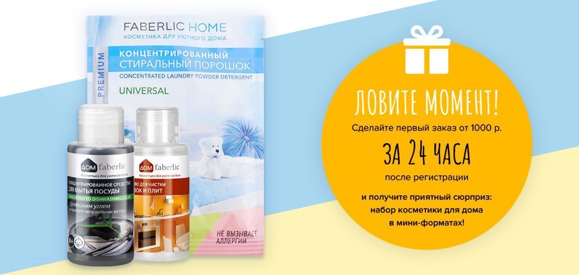 Сделайте свой первый заказ в течение 24 часов после регистрации (С 6 по 26 сентября) и получите в подарок набор косметики для дома Faberlic Home в мини-формате!