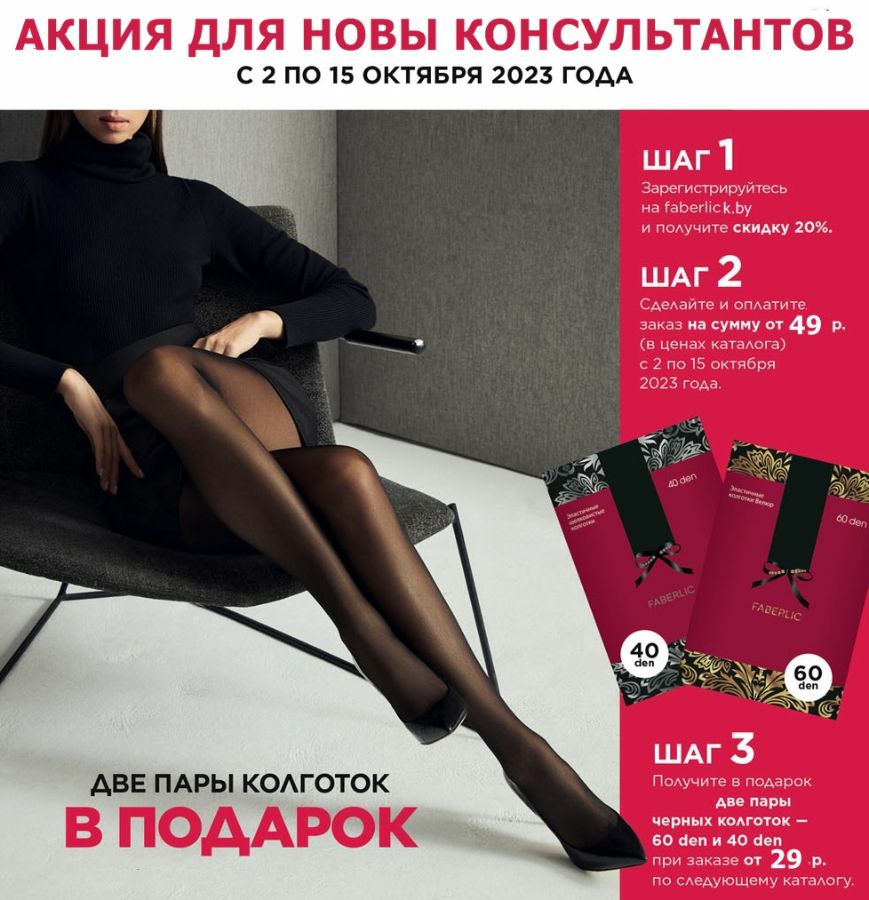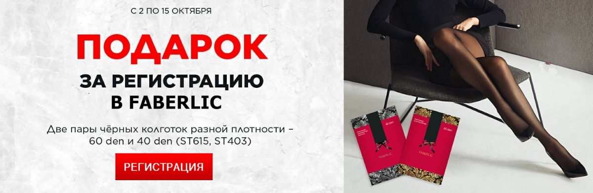 При бесплатной регистрации в Faberlic >> С 02 по 15 октября 2023 года Вы получите две пары чёрных колготок - 40 и 60 den в подарок и скидку 20-26% от стоимости заказа.