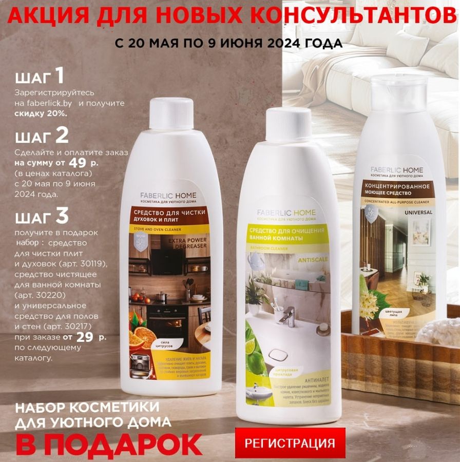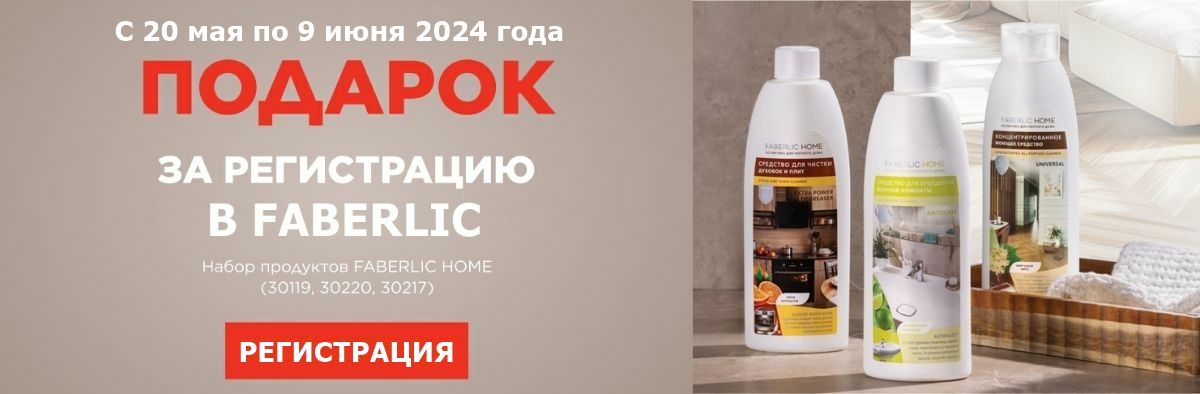 При бесплатной регистрации в Faberlic >> С 20 мая по 9 июня 2024 года Вы получите набор косметики для уютного дома серии Faberlic Home из трёх продуктов в подарок и скидку 20-26% от стоимости заказа.
