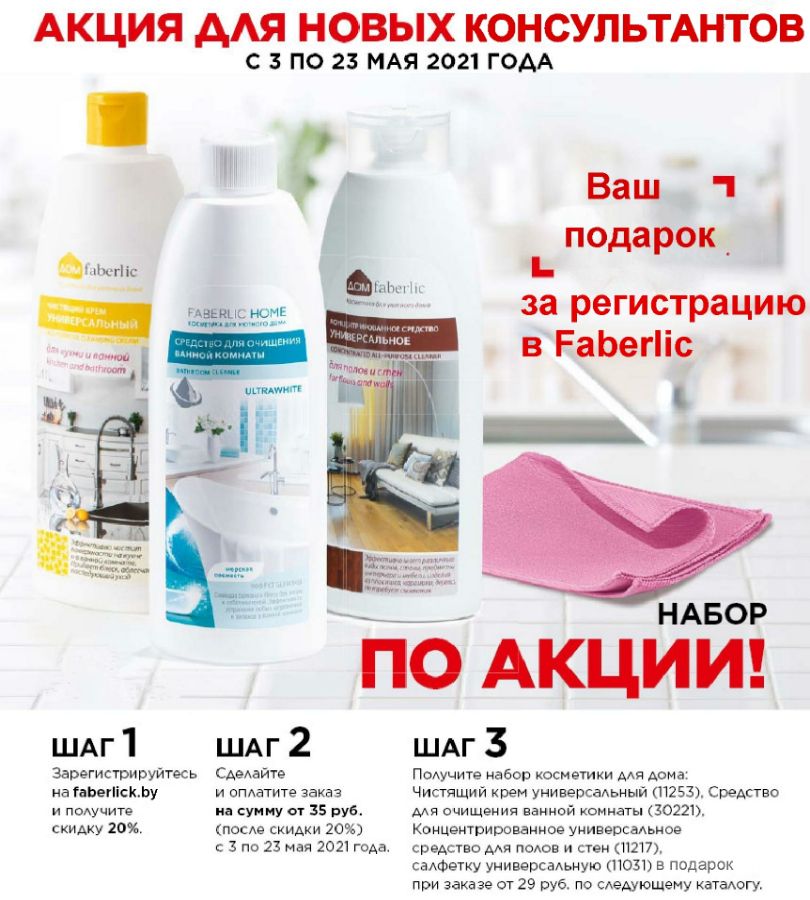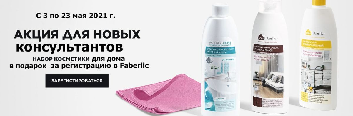 При бесплатной регистрации в Faberlic >> С 3 по 23 мая 2021 г. Вы получите набор косметики для дома из четырёх продуктов: