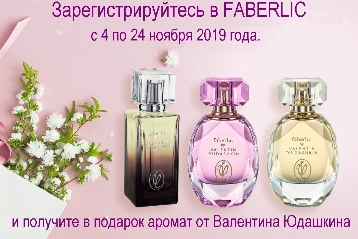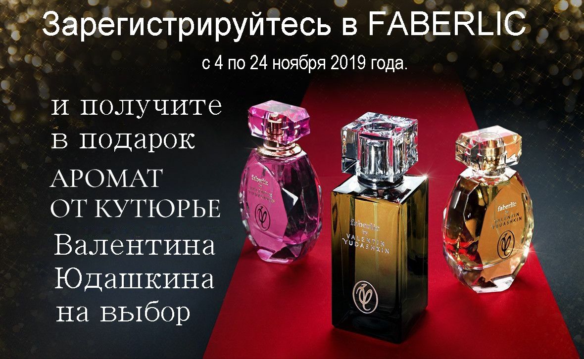При бесплатной регистрации в Faberlic >> в каталоге №16 (С 04 по 24 ноября 2019 г.) Получите один из эксклюзивных ароматов от всемирно известного кутюрье Валентина Юдашкина на выбор в подарок и скидку 20-26% от стоимости заказа.