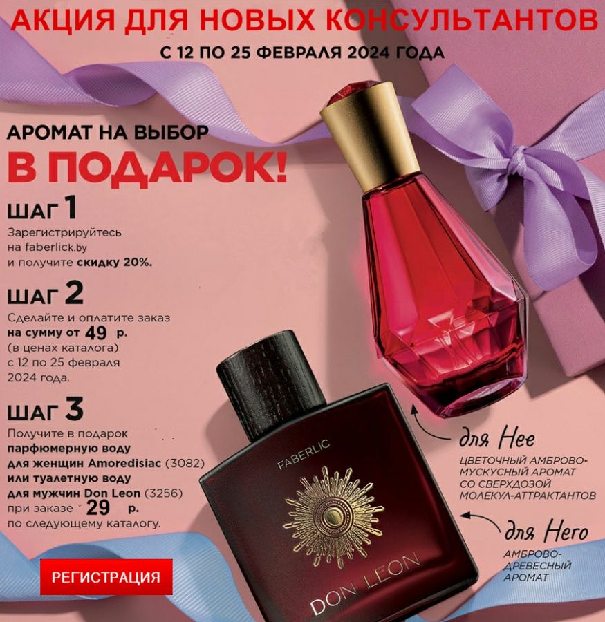 При бесплатной регистрации в Faberlic >> С 12 по 25 февраля 2024 года Вы получите любой аромат на выбор в подарок и скидку 20-26% от стоимости заказа: