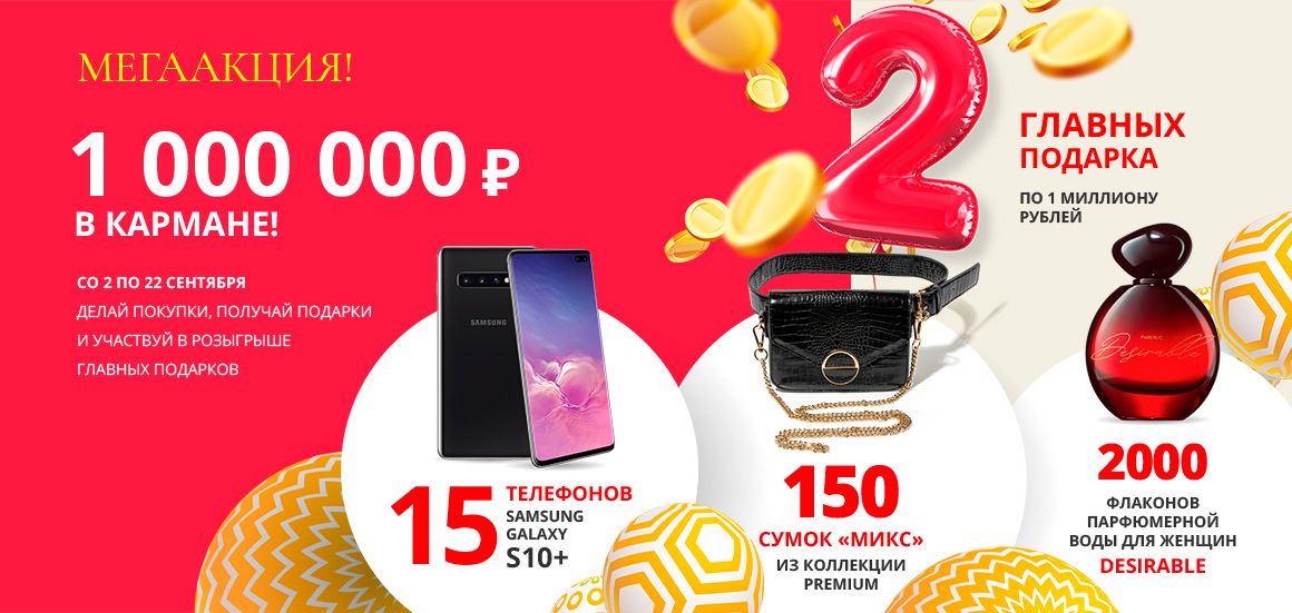 Если у тебя есть карта МЕГАакции «Миллион в кармане», то ты уже обладатель гарантированного подарка от Faberlic*, и имеешь все шансы стать победителем! Чем больше карт ты активируешь, тем больше у тебя возможностей получить главные призы: