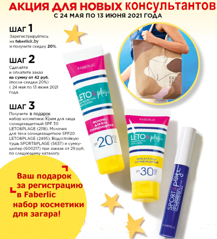 При бесплатной регистрации в Faberlic >> С 24 мая по 13 июня 2021 г Вы получите набор косметики для загара из четырёх продуктов:
