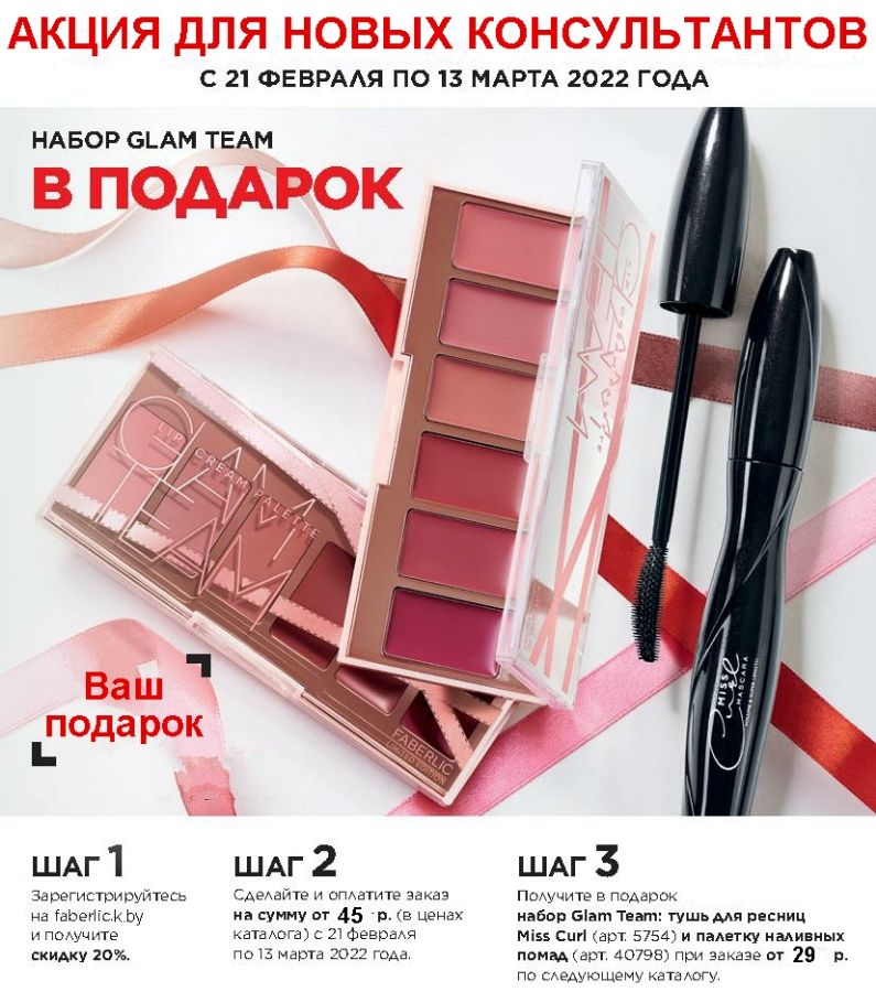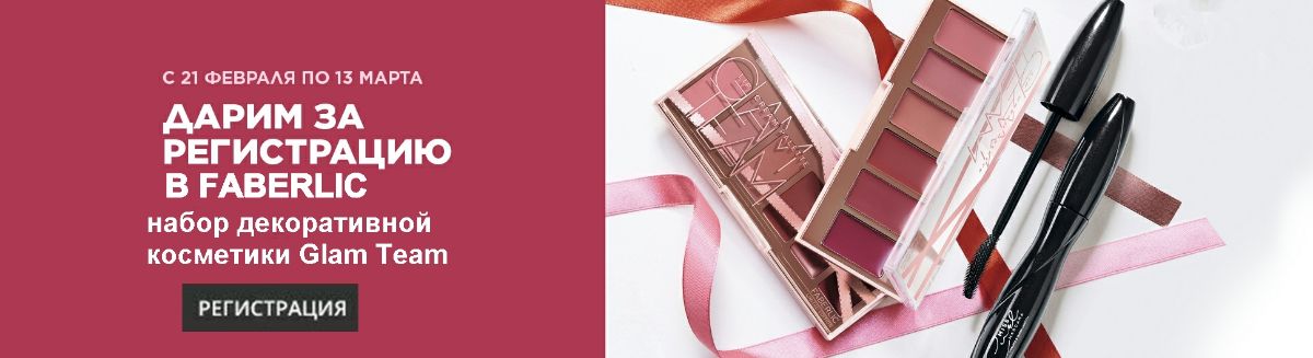 При бесплатной регистрации в Faberlic >> С 21 февраля по 13 марта 2022 г. Вы получите набор декоративной косметики Glam Team из двух продуктов в подарок и скидку 20-26% от стоимости заказа.