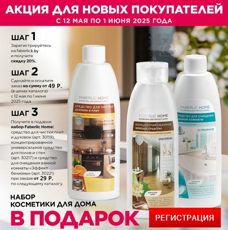 При бесплатной регистрации в Faberlic >> С 12 мая по 01 июня 2025 года Вы получите набор косметики для дома серии Faberlic Home из трёх продуктов в подарок и скидку 20-26% от стоимости заказа.