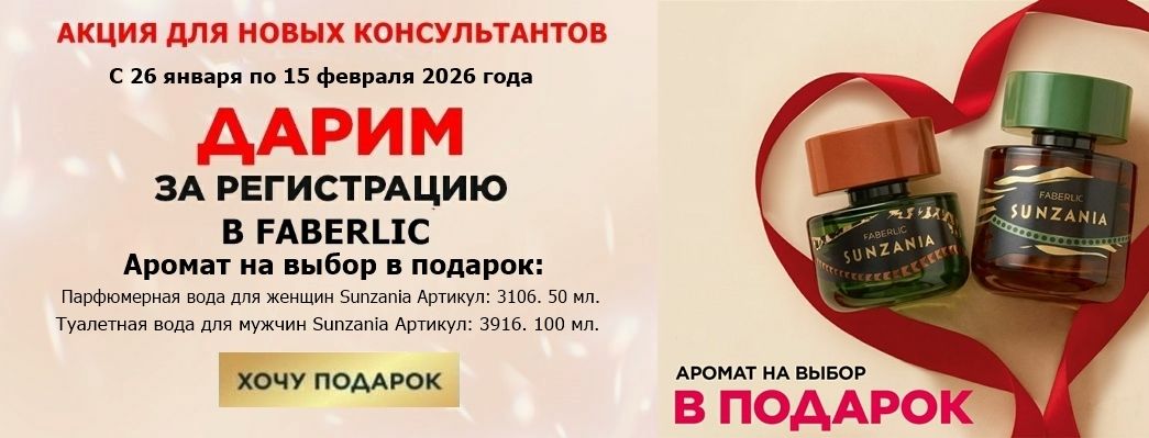 При бесплатной регистрации в Faberlic >> С 26 января по 15 февраля 2026 года Вы получите один из ароматов на выбор в подарок и скидку 20-26% от стоимости заказа: