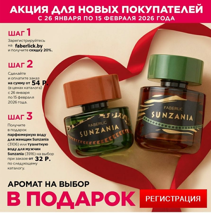 ШАГ 3) В каталоге №3 (С 16 февраля по 1 марта 2026 г.) При оформдении заказа от 32 Бел. руб. для Беларуси или от 1 000 Российских руб. для России (в ценах каталога) получите в подарок один из ароматов на выбор: Парфюмерная вода для женщин Sunzania Арт: 3106. 50 мл. или Туалетная вода для мужчин Sunzania Арт: 3916. 100 мл.