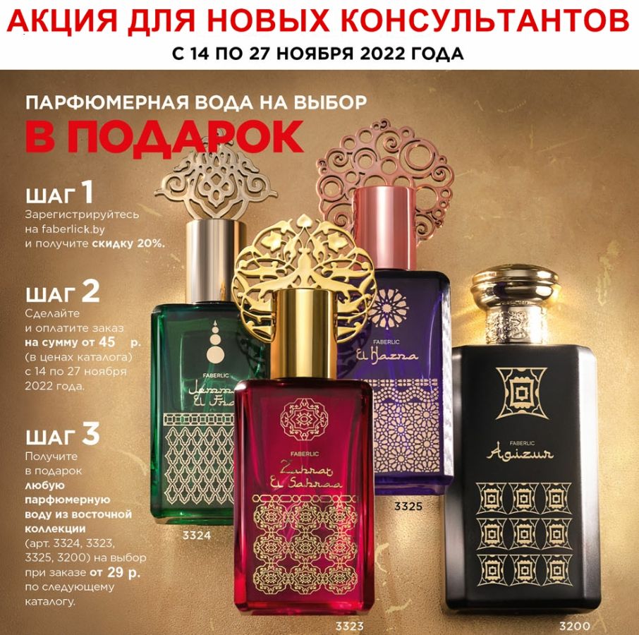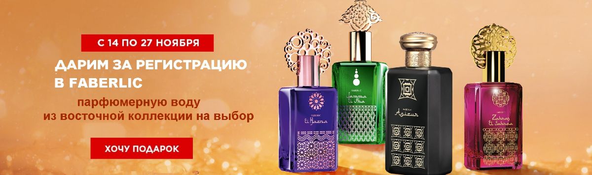 При бесплатной регистрации в Faberlic >> С 14 по 27 ноября 2022 г. Вы получите любую женскую или мужскую парфюмерную воду из восточной коллекции на выбор: