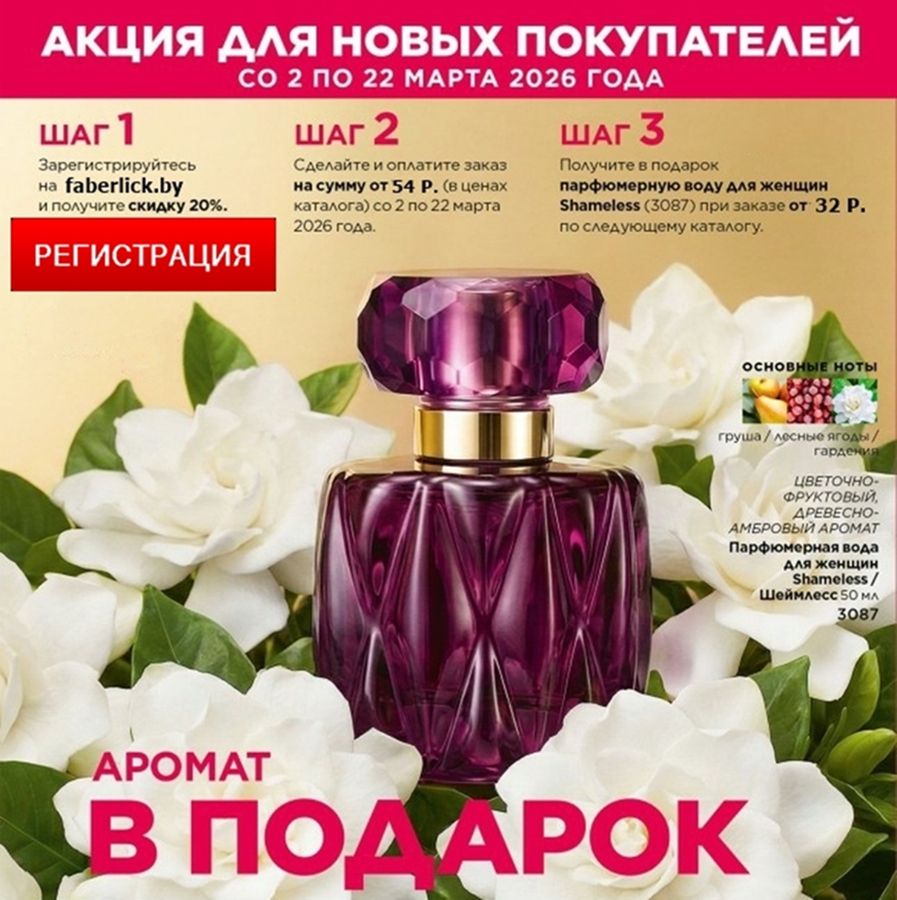 При бесплатной регистрации в Faberlic >> С 2 по 22 марта 2026 г. Вы получите парфюмерную воду для женщин Shameless. Артикул: 3087. Объем: 50 мл. в подарок и скидку 20-26% от стоимости заказа.