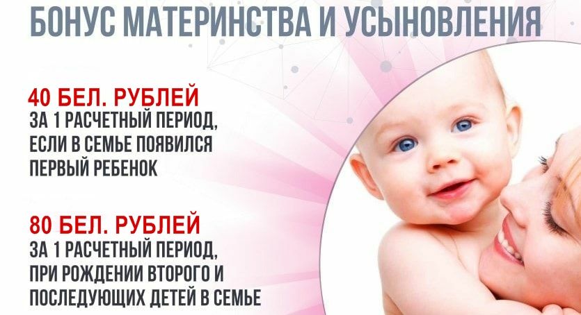- 1500 рублей для России, 40 бел. руб для Беларуси за расчетный период в течение года, если в семье появился первый ребенок;