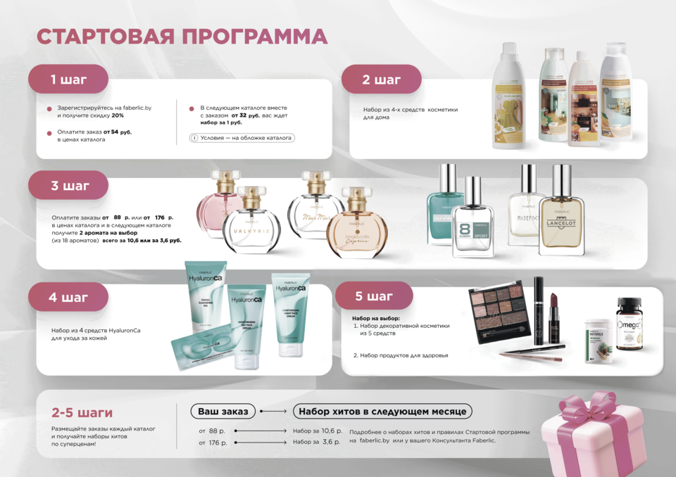 Новый Консультант может продолжить участие в Стартовой программе после однократного пропуска любого шага. Внимательно ознакомьтесь с условиями и получайте наборы хитов Faberlic по приятным ценам!